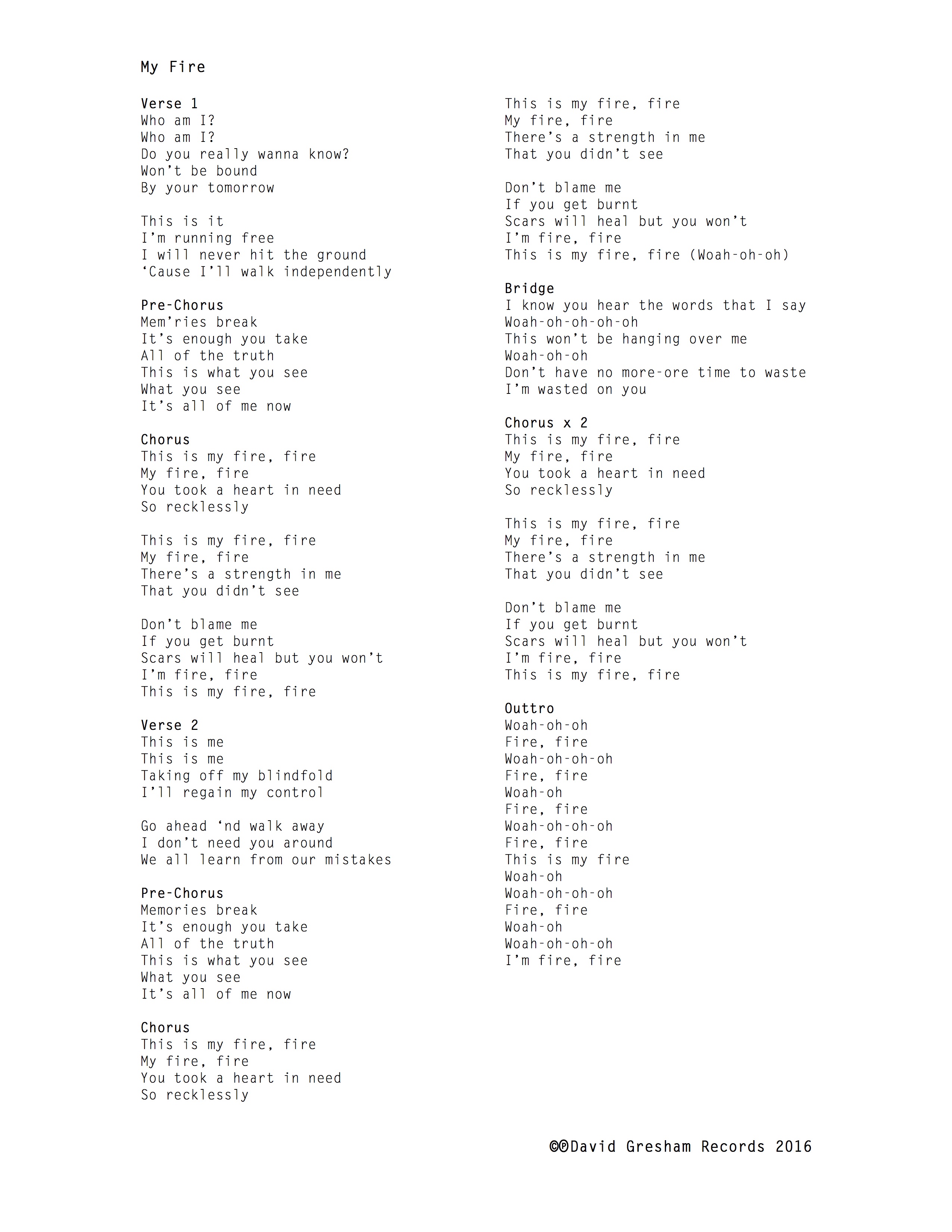 It was September last year when I first heard “My Fire”. The vocal was epic, Sarah has a beautiful voice, herself. I knew I had to work very hard on creating magic on this record. The more I rehearsed, the more it became mine. To deliver, you have to own it. It was a massive bundle of joy hearing the label, songwriter and publisher give the go ahead. As it is an immense amount of pressure waiting on this great team of people to show the thumbs up.
